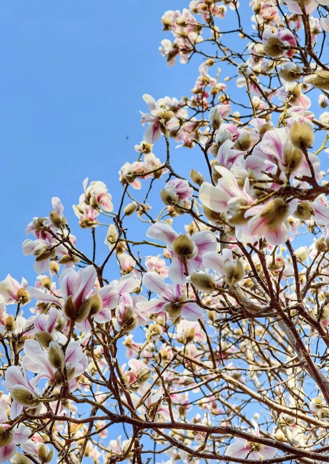 沿着小径深入北园,另一种气质的花事正在上演。玉兰以孤傲之姿登场,未叶先花,亭亭如盖。那素白的花瓣托着嫩黄的蕊,以湛蓝的天空为纸,勾勒出极简的水墨意境,是独属于早春的清冷风骨。