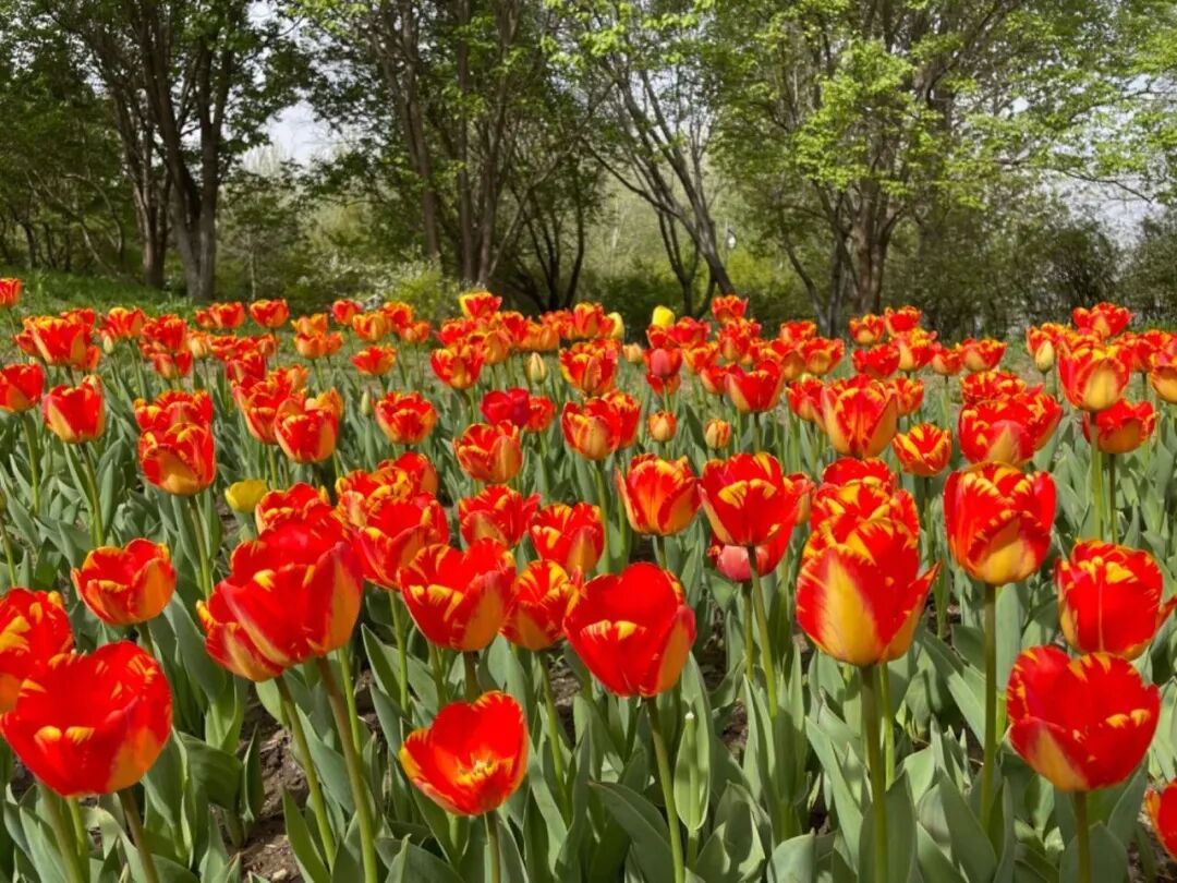 行至生态廊道桥,视线会被地下的绚烂吸引。郁金香竞展花盏,绛红如丝绒、鹅黄如暖阳、柔粉如烟霞,交织铺陈。随风轻曳间,满径浮香,是春日最标准的浪漫。